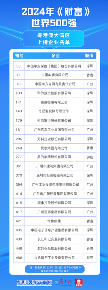 从排名变化来看,今年大湾区共13家企业较去年排名上升或持平,分别是中国华润有限公司、中国南方电网有限责任公司、华为投资控股有限公司、腾讯控股有限公司、比亚迪股份有限公司、招商银行股份有限公司、美的集团股份有限公司、广州市建筑集团有限公司、深圳市投资控股有限公司、广州工业投资控股集团有限公司、广东省广新控股集团有限公司、广州医药集团有限公司、长江和记实业有限公司。
