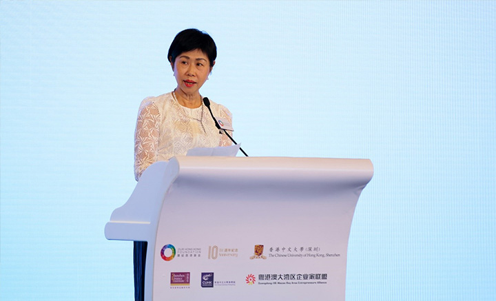 团结香港基金总裁李正仪、香港中文大学(深圳)协理副校长王丛、香港特区政府商务及经济发展局署理局长陈百里,广东省发改委副主任、省大湾区办常务副主任朱伟,全国政协常委、粤港澳大湾区企业家联盟主席、新华集团主席蔡冠深,以及粤港澳大湾区企业家联盟联席主席、香港中华厂商联合会会长卢金荣致开幕辞。