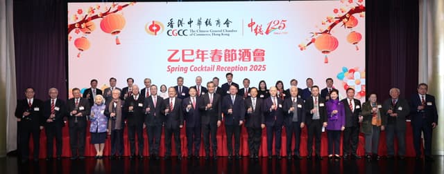 香港中华总商会(中总)今天(7日,正月初十)假香港君悦酒店举行“乙巳年春节酒会”。全国政协副主席梁振英、署理行政长官陈国基、中联办副主任尹宗华、外交部驻港特派员公署特派员崔建春及律政司司长林定国应邀担任主礼嘉宾,联同该会各首长向出席来宾祝酒,欢庆新春。