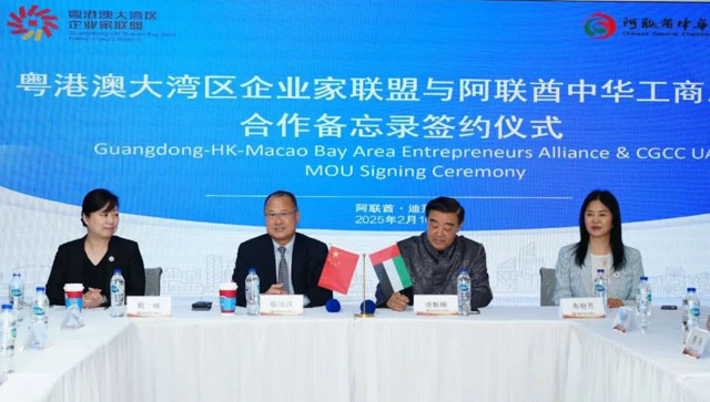 会谈后,粤港澳大湾区企业家联盟阿联酋分会执行会长戴一楠与阿中总会长唐振刚签署了合作备忘录。该备忘录涵盖了双方合作的重点领域、合作方式、合作机制等,为未来合作提供了明确的指导和有力保障。双方达成共识,将于今年合适时间共同在中国内地举办第三届双湾论坛及阿联酋经贸推广活动。