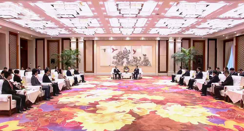 2025年4月27日,江苏省委书记、省人大常委会主任信长星在南京会见全国政协常委、香港中华总商会会长、粤港澳大湾区企业家联盟主席香港新华集团主席蔡冠深所率的企业家代表团,就深化苏港合作、携手江苏企业共同“出海”等进行探讨。
