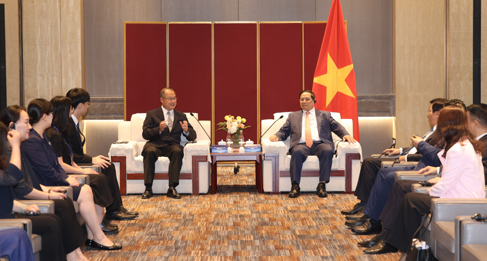 2025年6月24日,第十六届夏季达沃斯论坛期间,越南社会主义共和国政府总理范明政在天津会见中国全国政协常委、粤港澳大湾区企业家联盟主席蔡冠深。