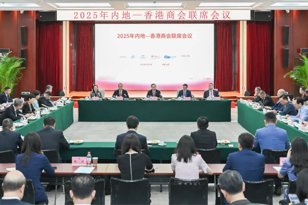 2025年7月15日,全国政协常委、粤港澳大湾区企业家联盟主席、香港中华总商会会长蔡冠深,全国政协委员、粤港澳大湾区企业家联盟联席主席、香港中华厂商联合会会长卢金荣,在北京出席由中国贸促会、香港中华厂商联合会、香港中华总商会、香港工业总会及香港总商会组成的“2025年内地—香港商会联席会”,与香港及内地的商会代表就如何在全球新格局下,深化两地科创联动与供应链协同,进一步发挥香港独有优势,推动内地与香港工商界携手开拓国际市场新机遇,支持香港融入国家发展大局等议题进行了深入探讨。