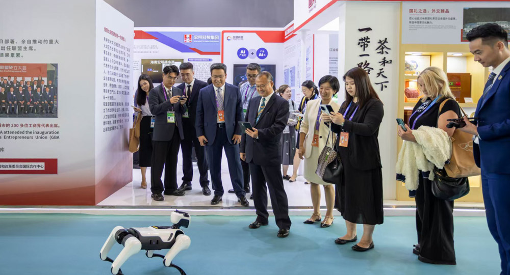 东博展会上,蔡冠深一行参观多家企业和机构,包括国家级专精特新小巨人企业——浙江创邻科技,其自主研发的国产原生高性能图数据库Galaxybase打破多项世界纪录;专注于复杂场景工业级无人机应用企业——航大汉来;国内高端直驱设备领先的制造商——佛山德玛特智能装备科技有限公司,以及佛山南海总商会、新华国茶、柬埔寨贡布中-柬(泰文隆)工业经济特区展台。