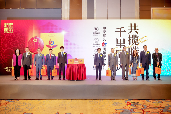 新华国茶特为此次推介及庆祝活动定制了“中柬友谊茶”,包装色调取自两国国旗颜色,并展现了中国龙和柬埔寨著名地标“高棉的微笑”,表达了对两国长期友好往来的良好祝愿。