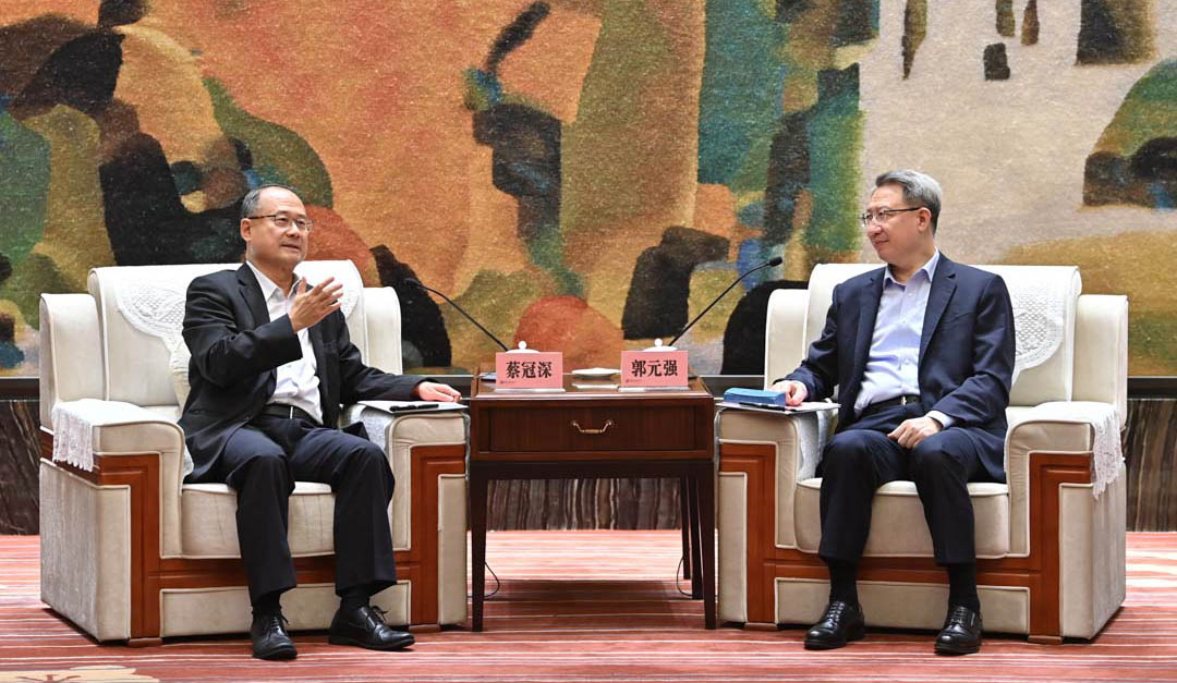 5月8日,湖北省委常委、武汉市委书记郭元强会见全国政协常委、粤港澳大湾区企业家联盟主席、香港中华总商会会长、香港新华集团主席蔡冠深一行。