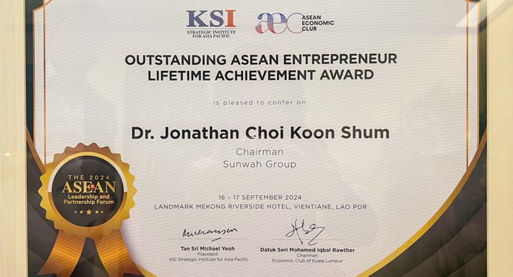 On September 16, the ASEAN Leadership and Partnership Forum 2024 (ALPF) was held in Laos . Dr. Jonathan Choi, Chairman of the Guangdong-HK-Macao Bay Area Entrepreneurs Alliance, Chinese General Chamber of Commerce and Sunwah Group, was awarded the "Outstanding ASEAN Entrepreneur Lifetime Achievement Award" by the organizer for his outstanding performance in the business field, outstanding leadership in corporate social responsibility and outstanding contribution to the ASEAN region.