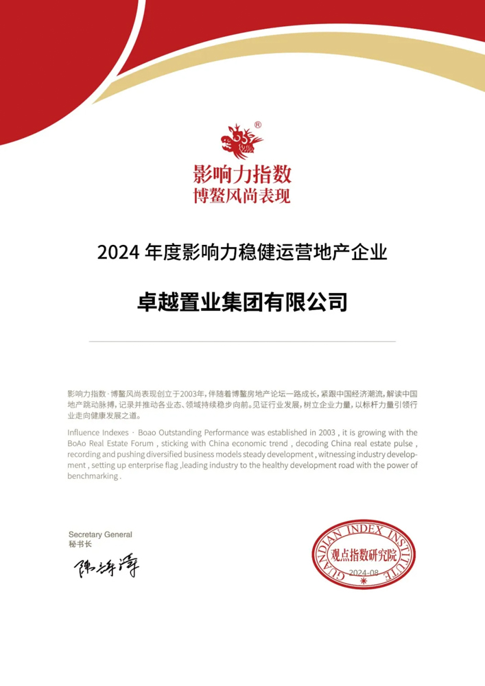 而在前一日由观点机构主办的“影响力指数·2024博鳌风尚盛典”上,卓越集团亦凭借在复杂环境中表现出的战略定力与经营韧性,荣膺“2024年度影响力稳健运营地产企业”!