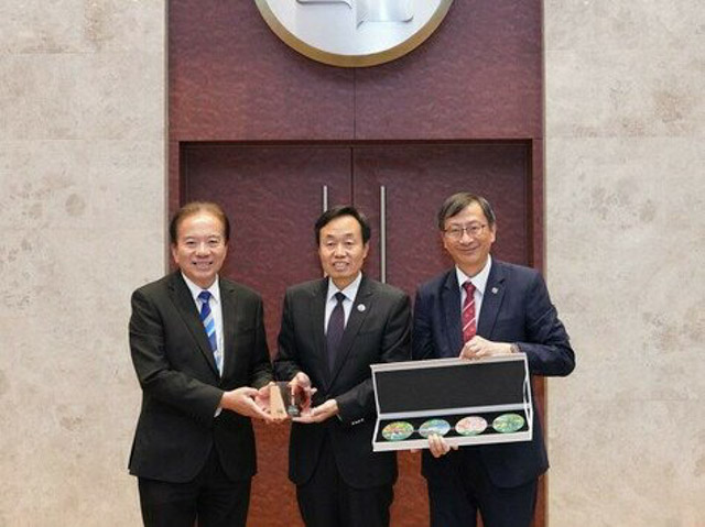 粤港澳大湾区企业家联盟副主席、教大校董会主席黄友嘉博士(左)以及教大校长李子建教授(右)向王世廷大使(中)致送纪念品