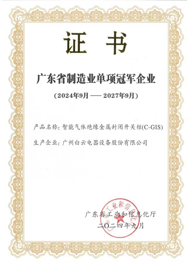 近日,全国政协委员、广东省工商联副主席、联盟副主席胡德兆旗下广州白云电器设备股份有限公司凭借多年来在电力装备领域的创新研发、生产制造和经营管理等方面的基础和成效,以及核心产品智能气体绝缘金属封闭开关柜(C-GIS)技术和细分产品市场优势,荣获广东省工业和信息化厅评定的“广东省制造业单项冠军企业”称号。
